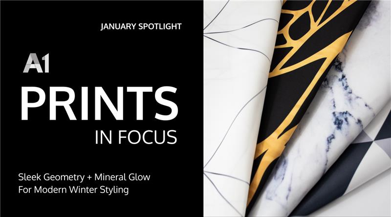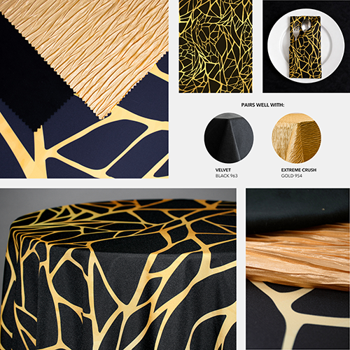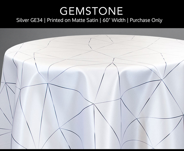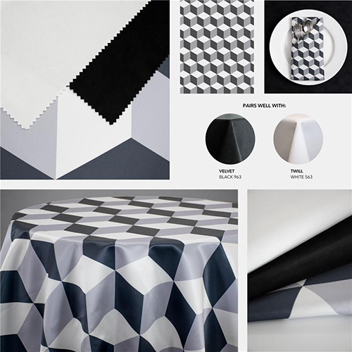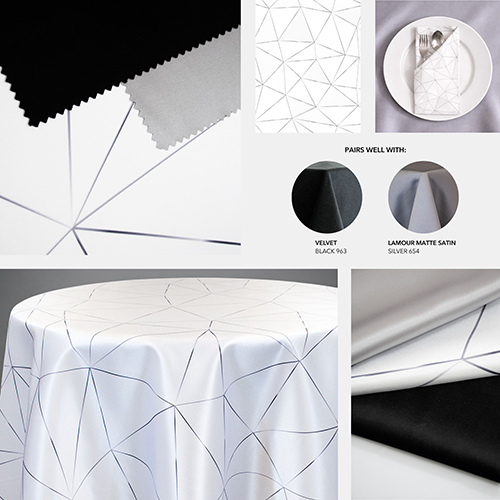 January events often call for a clean, elevated look that feels formal without being overly decorative. A1’s Custom Print selections for January do exactly that by replacing florals with structured patterns, subtle texture, and a controlled mix of matte and shine. The color palette stays intentionally narrow. Black, grey, silver, white, and a touch of gold are all you need. This keeps the table polished and allows the fabrics and prints to stand out under evening lighting. This design story centers around four custom prints that work well for galas, award dinners, and upscale winter events.