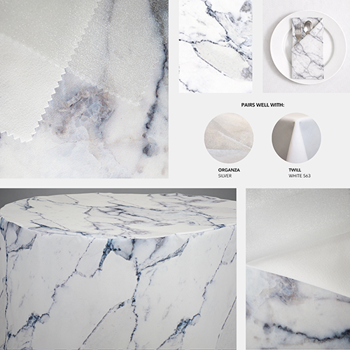 Organza Silver adds dimension when used as an overlay. It works especially well layered over Cubes Grey or Marble White for evening events.