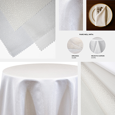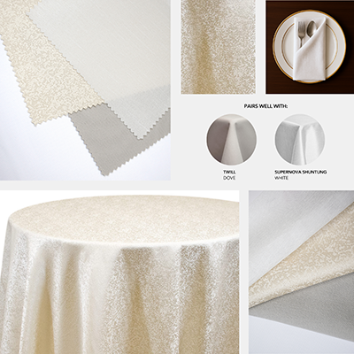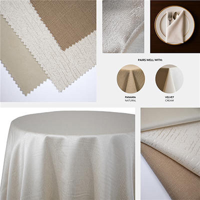 January events often call for a clean, simple look, and neutral linens are an easy way to achieve that effect. Instead of relying on color, this approach focuses on texture, subtle shine, and layering to create interest. A1’s Designer Collection features three key linens that do most of the work: Bonfire, Stealth, and Burst.