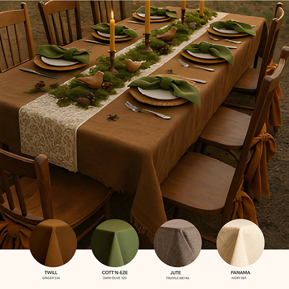Earth + Ember embraces the Rustic Boho spirit with a palette and texture story that feels organic, artisanal, and deeply connected to the autumn season. The setting reflects intentional design choices with woven textiles, earthy tones, and folkloric prints that honor craftsmanship while inviting warmth and intimacy.