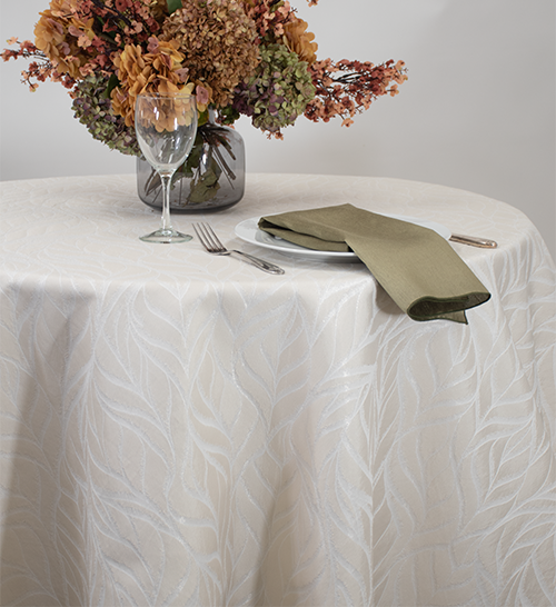 A layered leaf pattern woven into the fabric, adding subtle texture and a touch of sophistication to any table setting. Available in classic White and soft Beige, its sheen and detailed stitching create an elegant, natural look.